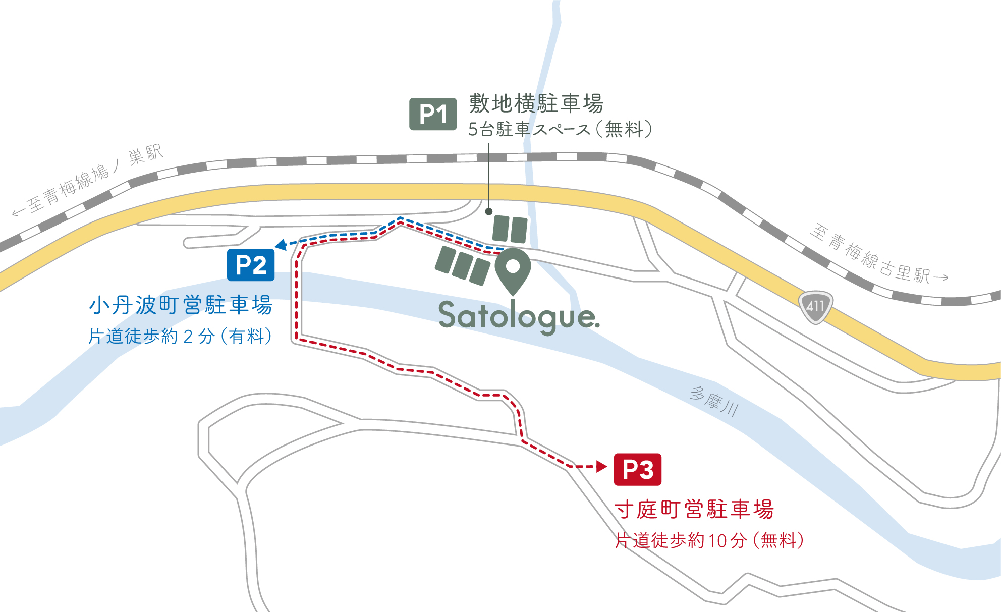 The road that turns off Ome-kaido and leads to Sato Rogue is very narrow. For the safety of local residents, we ask that you drive slowly. Thank you for your understanding.